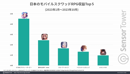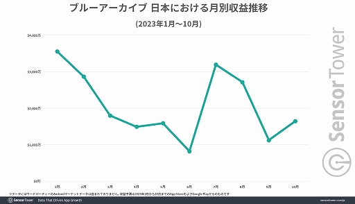 ブルーアーカイブの2023年1月から10月までの日本における収益では,「ウマ娘 プリティーダービー」「勝利の女神:NIKKE」に続く3位となっている。なお,収益ランキングトップ5には,ウマ娘 プリティーダービーのほか,4位に「ヘブンバーンズレッド」,5位に「メメントモリ」がランクインしている。