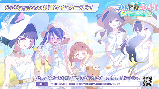 株式会社Yostarは、アプリゲーム『ブルーアーカイブ -Blue Archive-』(開発:NEXON Games社)において、まもなく3.5周年を迎えることを記念して特設サイトをオープンしました。さらに3.5周年を記念した公開生放送「夏のブルアカらいぶ!はっぴ〜さま〜しょ〜たいむ!SP」を7月21日(日)に実施することをお知らせします。