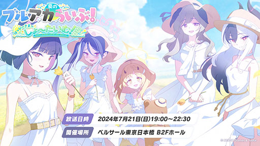 同サイトには,白いワンピースを着用したカズサ,カヨコら生徒たちを描いたキービジュアルや,7月21日に実施する公式生放送「夏のブルアカらいぶ!はっぴ〜さま〜しょ〜たいむ!SP」に関する情報が掲載されている。なお,6月23日に掲載した記事でもお伝えしたとおり,次回の公式生放送は,ベルサール東京日本橋を舞台に公開生放送で開催される。観覧チケットは2000円(税込),6月30日23:59まで抽選申込みが受け付けられている。