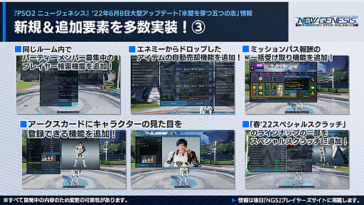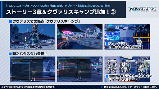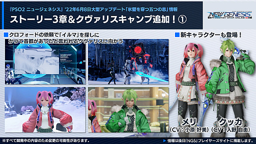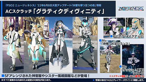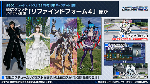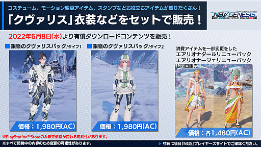 クヴァリスの探索セクション「レイヨルド峡江」に,エンシェントエネミーが追加される。また,“新世コスチュームリクエスト総選挙”の上位コスが「NGS」仕様で登場。こちらは,SGスクラッチでの配信だ。