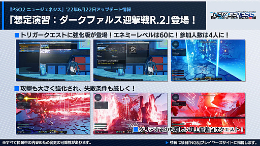 トリガークエストの強化版として,「想定演習:ダークファルス迎撃戦R.2」が配信される。エネミーレベルは60で,参加可能人数は4人と,かなり高難度な内容になっているようだ。