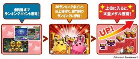 イベント期間中に貯まったランキングポイントの総数に応じて順位が決まり、上位入賞すると、ランキングボーナスのメダルを最大20,000枚獲得できます。