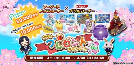 期間中は、KONAMIのアミューズメント施設向けメダルゲームと「コナステ メダルコーナー」双方で貯まるポイントを「今月のプレゼントキャンペーン(4月)」特設サイトで使用し、好きなプレゼントの抽選に応募できます。