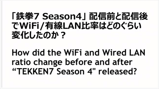続いてのテーマは,「ネットワーク対戦のニーズの高まりと対応について」。ここで原田氏は「鉄拳7」シーズン4の配信前と配信後におけるWi-Fi接続と有線接続の統計データを公表する。「鉄拳7」シーズン4では,オンライン対戦の大幅改修と,Wi-Fi接続をプレイヤー同士で可視化する仕様を導入したのだが,そのうえでプレイヤーの接続状況がどのように変化したのかを報告したわけだ。