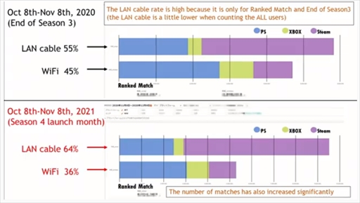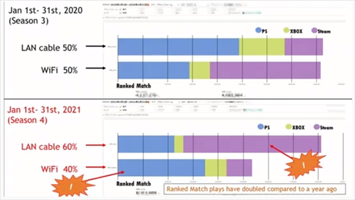 結果としては,接続状況の可視化後はPC版では有線接続が増えたものの,コンソールではWi-Fi接続の割合が上昇しているとのこと。コンソールではカジュアルなプレイヤーの参入が多く,Wi-Fi接続のまま遊ぶ傾向にあるようだ。また,接続状況を可視化したことで,Wi-Fi接続のプレイヤーがオンライン対戦に参加しにくいのではないかという懸念にも触れたが,カジュアルに対戦する人も増えており,全体ユーザーの8割ほどは接続方法をあまり気にしていないと思われるとも話していた。
