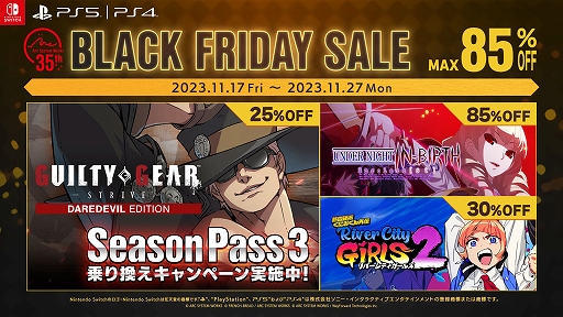アークシステムワークス株式会社は、本日2023年11月17日(金)より2023年11月27日(月)まで、新たに『GUILTY GEAR -STRIVE-(ギルティギア ストライヴ)』を始める方に最適なタイトル『GUILTY GEAR -STRIVE- デアデビルエディション』や、世界中のファンを魅了する正統派近代小説感覚2D対戦格闘『UNDER NIGHT IN-BIRTH Exe:Late[st]』、キュートな魅了が爆発するベルトスクロールアクション『熱血硬派くにおくん外伝リバーシティガールズ2』ほか、対象タイトルが最大85%オフでお楽しみ頂ける「Black Friday Sale」を開催します。