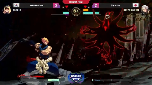 「GUILTY GEAR -STRIVE-」部門のウィナーズファイナルは,国内外の大規模大会でも結果を残すティーワイ選手と,さまざまなタイトルで結果を残す韓国のINFILTRATION選手の組み合わせ。試合はティーワイ選手のチップが1セットめを先取するも,エディを絡めた強烈な固めと崩しを見せたINFILTRATION選手が2セット連取し,グランドファイナル進出に王手をかける。
