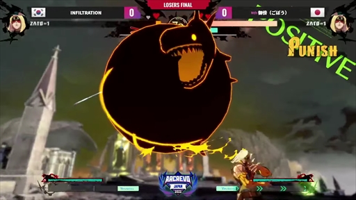 どちらのキャラを使うかが注目された御榜選手だが,ザトーをピックしたことで同キャラ対決に。お互いにミラーマッチを意識した対策が光ったが,要所の読みで上回る御榜選手がセットを連取,瞬く間にリーチをかける。INFILTRATION選手も粘りを見せ,1セット奪うもここまで。4セットめを御榜選手がストレートで勝利し,ルーザーズサイドのグランドファイナルへと勝ち進んだ。