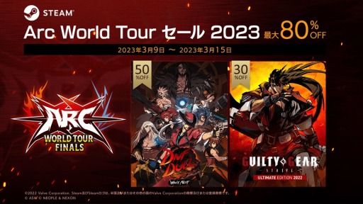 アークシステムワークス株式会社は、本日2023年3月9日(木)より3月15日(水)まで、『GUILTY GEAR ‐STRIVE‐ ULTIMATE EDITION 2022』や『DNF Duel』の他、対象タイトルが最大80%オフでお楽しみ頂けるSteam「Arc World Tour セール 2023」を開催中です。