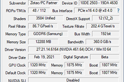 グラフィックスメモリはGDDR6で,メモリインタフェースは192bitと,RTX 3060 Tiや「GeForce RTX 2060 SUPER」(以下,RTX 2060 SUPER)などの256bitよりは狭くなっている。一方で,メモリクロックは15GHz相当と,RTX 3060 Tiなどの14GHz相当よりも引き上げられており,メモリバス帯域幅は360GB/sと,RTX 3060 Tiなどの448GB/sと比べると80%程度となる。このあたりは,NVIDIAがRTX 3060のターゲットとして,フルHDの60fpsで新作ゲームをプレイすることを想定しているためだろう。
