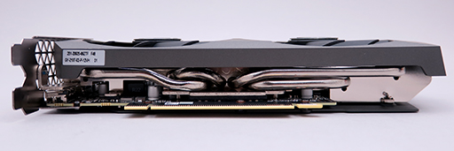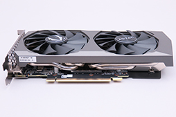 カード後方に74mmほどはみ出た格好のGPUクーラーは,2スロット占有タイプで90mm径相当のファンを2基搭載する。GPUコアへの負荷が低い,いわゆるアイドル時にファンの回転を停止する機能も備えていた。