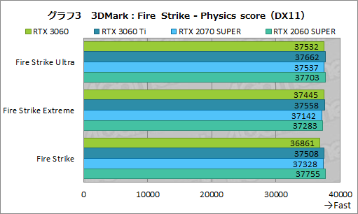 同じくFire Strikeから,ソフトウェアベースで「Bullet Physics」を実行する事実上のCPUテスト「Physics test」の結果を抜き出したものがグラフ3となる。CPUが共通なので,スコアはおおむね3万7000程度で横並びとなっている。