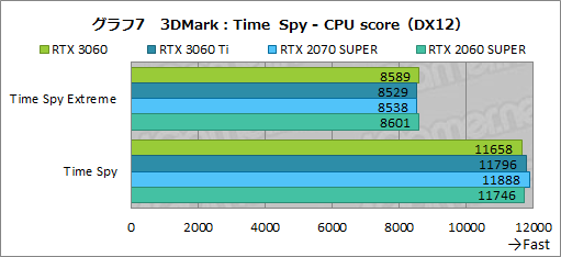 Time SpyにおけるCPU testの結果がグラフ7だ。ここではFire Strikeと同様に,CPUが同じなのでスコアもほぼ横並びとなった。