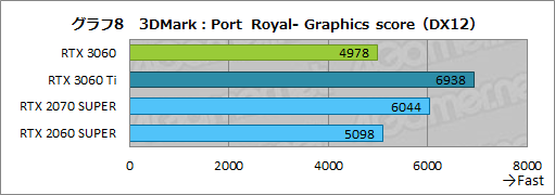 ここでも,RTX 3060はRTX 3060 Tiの約71%と,Fire StrikeやTime Spyと同じ傾向だ。ただ,注目したいのはRTX 2060 SUPERとの優劣で,第2世代RT Coreを擁するRTX 3060でも,第1世代RT CoreのRTX 2060 SUPERに約2%の差を付けられた。Port Royalでは,RT Coreの世代差があまり結果に表れていない。