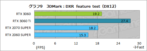 ここでも,RTX 3060はRTX 3060 Tiの68〜73%程度と,総合スコアを踏襲した形となった。また,RTX 3060がRTX 2060 SUPERに4〜5%程度届かない点も,総合スコアと変わらない。