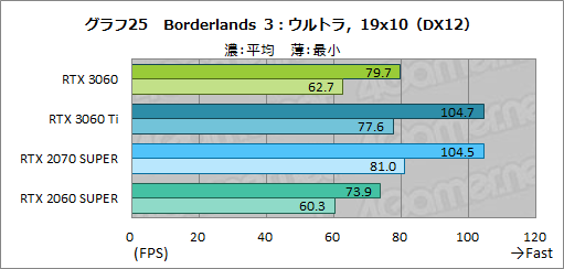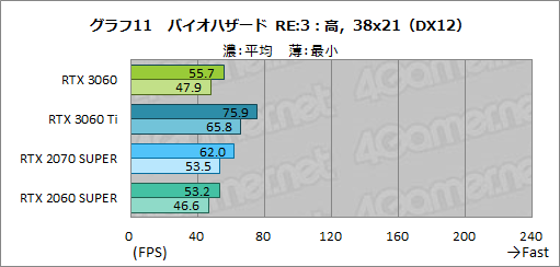 これまでとは打って変わって,RTX 3060は平均フレームレート,最小フレームレートともに,RTX 2060 SUPERに明確な差を付けることができず,ほぼ同程度になってしまっている。RTX 3060 Ti比では,平均フレームレートで70〜75%程度の結果に収まっているので,ここはRTX 2060 SUPERが意地を見せたといったところだろうか。
