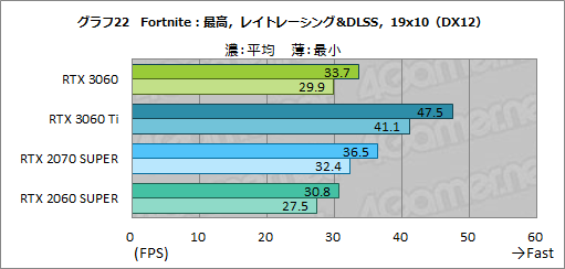 さらに,「Fortnite」に関しては,グラフィックスAPIをDirectX 12に変更したうえで,DLSSとレイトレーシングを有効にして,レイトレーシングの設定に関しては負荷が最大となるように変更したテストも行った。なお,テスト方法自体はレギュレーションと同じだ。