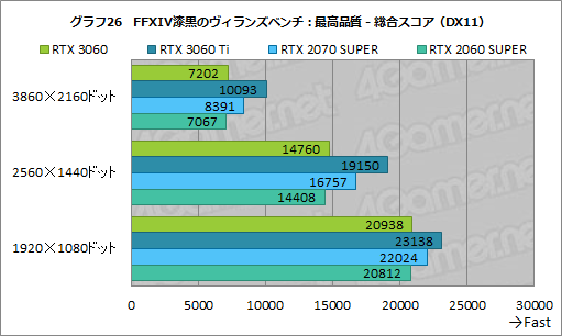 続いてグラフ26は「ファイナルファンタジーXIV: 漆黒のヴィランズ ベンチマーク」(以下,FFXIV漆黒のヴィランズ ベンチ)の総合スコアをまとめたものだ。