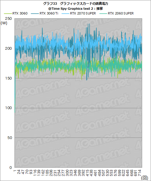 RTX 3060 Tiが200W前後で推移しているのに対して,RTX 3060は170W前後と,消費電力の低減をハッキリと見て取れる。180W以上となる場面をカウントしてみると,RTX 3060は39回あったのに対して,RTX 3060 Tiは694回と,その差は歴然だ。なお,RTX 2060 SUPERも同様に数えてみると38回で,RTX 3060 Tiとの差は,あまり見られない。