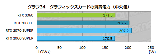 グラフ33の測定結果から,分かりやすくなるように中央値を求めたものがグラフ34となる。RTX 3060は約171Wと,NVIDIAが示した170Wに近い値を記録している。RTX 3060 Tiとの差も30Wほどと大きい一方で,RTX 2060 SUPERとの差はほとんどない。消費電力において,両GPUに明確な違いはなさそうだ。