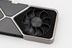 GPUクーラーは2スロット占有タイプで,90mm径相当のファンを2基搭載する。そのうち1基はカード後方の裏面側に取り付けられていて,表面から吸気を行ってそのまま裏面へ排気するという,NVIDIAが「フロースルー設計」と呼ぶ構造を採用している点もRTX 3080 Founders Editionと同じだ。なお,空冷ファンはファン部分と外枠が一体成型されたもので,GPUへの負荷が低いアイドル時には,回転を停止する機能が用意されている点も変わらない。