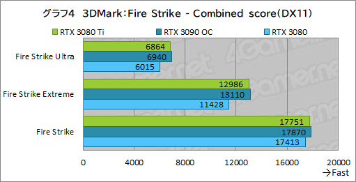 ここでは,CPU性能の影響が大きくなるためか,Fire Strike“無印”では,RTX 3080 TiとRTX 3080との差はほとんどなくなっている。しかし,それ以外では両GPUの差は14%ほどあり,Graphics scoreの結果に近い傾向が見て取れる。