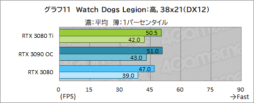 レイトレーシングを有効にして描画負荷も高めているため,全体的にフレームレートは低めだが,RTX 3080 TiとRTX 3080との差は,平均フレームレートで3〜7%程度に留まっている。また,RTX 3090 OCとでは,RTX 3080 Tiは1〜4%程度の差があり,3DMarkほど詰め切れていない。Watch Dogs LegionにおけるRTX 3080 Tiの立ち位置は,RTX 3090とRTX 3080の中間といったところか。