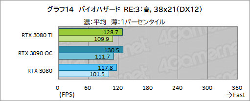 ここでも,RTX 3080 TiとRTX 3080との差は平均フレームレート4〜9%程度と10%に届いておらず,バイオハザード RE:3に似た傾向を示している。しかし,RTX 3090 OC比では,1920×1080ドットこそ約4%の差があるものの,それ以外ではほとんど差がなく,ほぼ横並びの性能と言っていい。