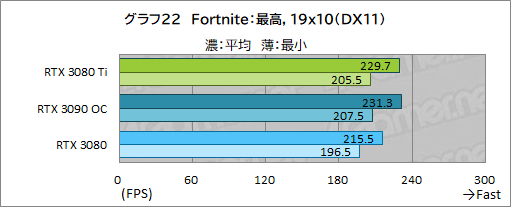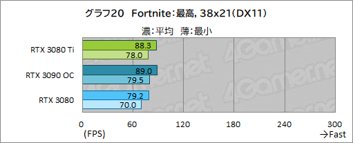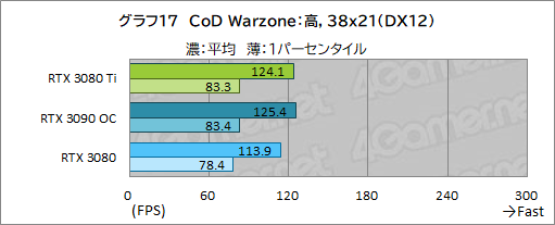 ここでは,CPU性能の影響が大きいためか,2560×1440ドット以下では,RTX 3080 TiとRTX 3080の差はあまり開いていない。ただ,3840×2160ドットではRTX 3080 TiはRTX 3080に10%程度の差を付けている点は立派だ。RTX 3090 OCとでは約1%の差が付いている。