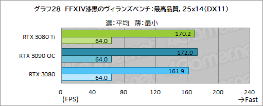 そんなFFXIV漆黒のヴィランズ ベンチにおける平均フレームレートと最小フレームレートをまとめたものがグラフ27〜29だ。