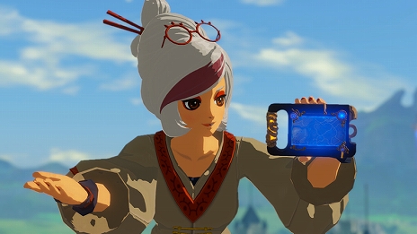 シーカーストーンを手にするプルア。映し出されたものを説明しているのか |
