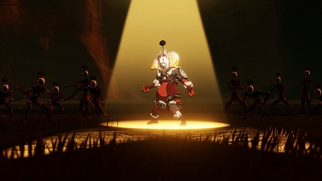 スポットライトを浴び、キメるコーガ様。まわりにはイーガ団が控えている |