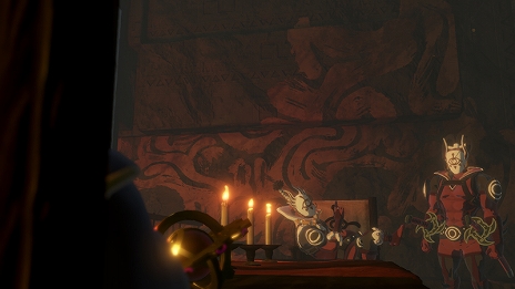 イーガ団アジト。コーガ様と共に、側近と思われる人物が立つ。向かい側には誰かが座っているようだ |