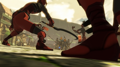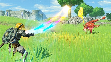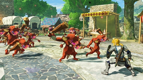 ハイラル城の城下町、屋台が並ぶ広場でボコブリンの群れに立ち向かうリンク |