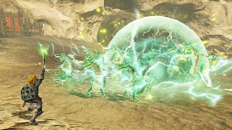 エレキロッドを掲げるリンク。放たれた電流が鉄箱を中心に周囲のリザルフォスへと伝わる |