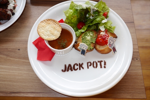 ダンテとバージル,そして「JACK POT!」の決め台詞の組み合わせでわかるとおり,「デビル メイ クライ 5」のエンディングがモチーフとなっている。友達と一緒に,“あの”掛け合いを再現したり,ゲームについて熱く語り合うのも楽しいだろう。メニューは,バゲットとサラダ,そしてミネストローネが1皿で楽しめる欲張り仕様。2つのバゲットはそれぞれダンテとバージルがモチーフで,友達がダンテかバージル推しならプレゼントしてみるのも楽しいのでは。