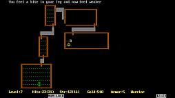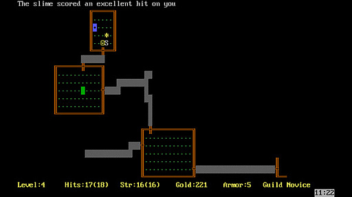 ゲーム画面の見方は,画面下側の黄色文字がプレイヤーのステータス。左から順に,ダンジョンの階層「Level」,体力「Hits」,力「Str」,お金「Gold」,防御力「Armor」,一番右の文字列が「ランク」を表している。ランクはプレイヤーレベルのようなもので,経験値を一定量獲得することで上昇し,それに伴いステータスも上がる。