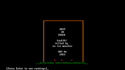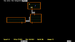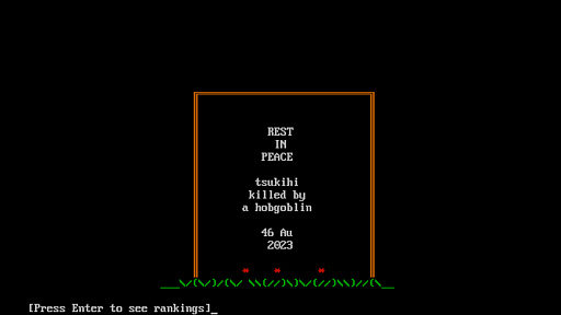 ランクは順調に上がるが,食べ物が見つからない。食べ物いっぱいだからレベリングしようとして,二歩目で落とし穴に落ちる。アイテムを識別できなさすぎてどうしようもない。Strを下げられまくる。視界が悪すぎて挟み撃ち。Hobgoblinへの攻撃が7連続ミス。そして死。