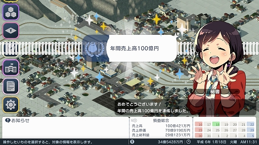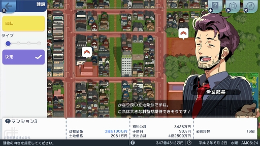 都市開発系のシミュレーションというと,なんだか難しそうなイメージが付きまとうが,本作には丁寧なチュートリアルのほか,プレイスタイルに合わせた難度選択や,社員達による行動指針のアドバイスが用意されていて,この手のゲームが初めての人でも遊びやすい。