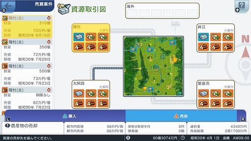 また本作は観光や鉄道だけでなく,株式や土地売買,子会社経営など,鉄道会社がするようなビジネスにも携われる。土地を発展させて値上がりした時に売却したり,株の売買で利益を出したり,木材や農産物といった「資源」を隣町に売ったりなど,資金を調達する手段はたくさん用意されている。街の発展にはとにかくお金が必要なので,余裕が出てきたらこういった細かいところに手を出してみるのも面白いだろう。
