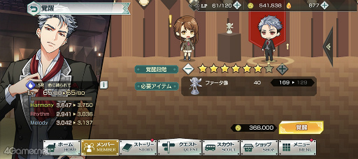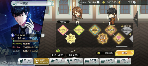 「メンバー」ボタンから,「個人練習」でカードのレベルアップ,「二人練習」で各種スキルやステータスをアップするのが手っ取り早い強化方法です。覚醒でも能力がグッと上がります。