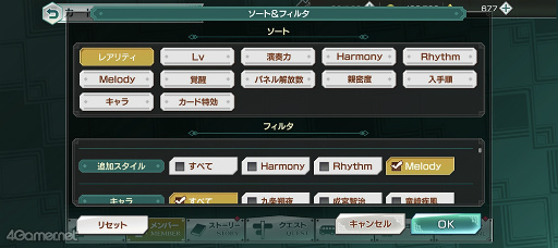 そもそもメロディを3枚揃えづらい場合は,あらかじめ,メロディスタイルを2つ持っているカードを編成するのがいいでしょう。フィルタ機能を使って「追加スタイル」のメロディにチェックを入れて絞り込み,ここから選んだカードを加えれば,山札にメロディの札が増えるわけなので,メロディを3枚揃えやすくなります。