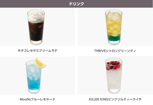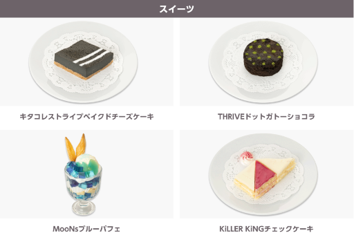 コラボカフェ史上最高クオリティの美味しさに挑戦し続けるCookpadTVが、 「料理はもっと楽しくて、 もっと自由だ」という想いを込めて、 B-PROJECTの「キタコレ」、 「THRIVE(スライブ)」「MooNs(ムーンズ)」、 「KiLLER KiNG(キラーキング)」4組のグループロゴや衣装を再現したコラボメニューを考案しました。