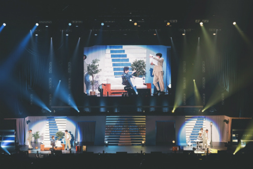 「LOVE MILLION」では,加藤さんと八代さんがカフェ風のセットで,まるでミュージカルのように生き生きと歌唱してみせた。ニコニコとリズムに乗って首を動かす八代さんに癒されていると,曲の合間に顎クイをしあう場面にドキドキさせられてしまう!