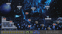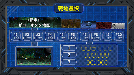 都市、遺跡、小惑星帯、工場、敵司令部の5つのロケーションにまたがるステージは総数50。