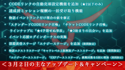 3月2日に実装される主なアップデート&キャンペーン一覧となります。特にご要望の高かった「CODEリンクの自動売却」や「ミッション報酬の一括受け取り」などが実装されます。ゲームアップデートに関してはギアジェネを遊んでいただいているユーザーの方々、新しくギアジェネを遊んでくれるユーザーの方々に「満足していただける遊び場」をご提供すべく日々皆様のお声を拝見させていただき、一つ一つ改善に努めてまいります。引き続き、ギアジェネの応援を宜しくお願いいたします。