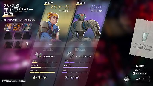 マルチプレイでも,まずはロビーから始まり,入るダンジョンとプレイキャラを選ぶところまではシングルプレイと同じだ。初回は,筆者がスウィーパー(サポート),担当編集はバンカー(タンク)を選択して2人で遊んでみた。