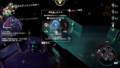モンスターたちは時間経過や一部の機能を使用する際にウェーブ単位で発生するので,プレイヤーは銃で攻撃しつつ,タレットを駆使してクリスタルボットを防衛する,というのが本作のタワーディフェンス要素だ。プレイヤーが全員倒れるか,クリスタルボットが破壊されると,その時点でゲームオーバーとなってしまう。