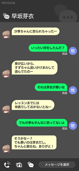プレイ中でも、プレイ外でもアイドルからあなたへ悩みの相談や仕事の連絡のメッセージが届く!
