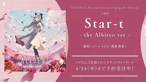 本楽曲は,ALTDEUS本編のとあるエンディングで流れる楽曲「Star-t」をもとに,日本語歌詞を新たに制作。Singing the Albireoで主役となる「コーコ ココノエ」役の奥野香耶さんが歌唱している。